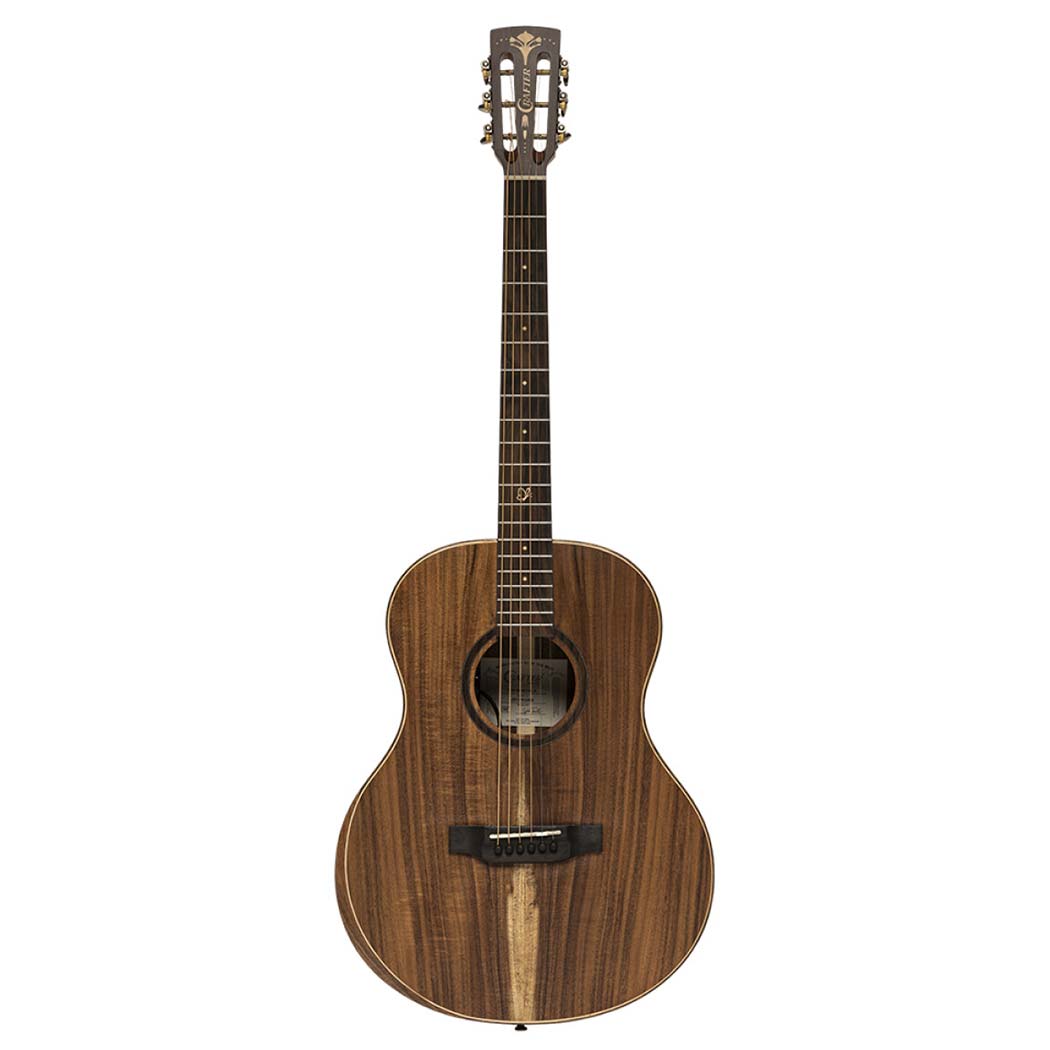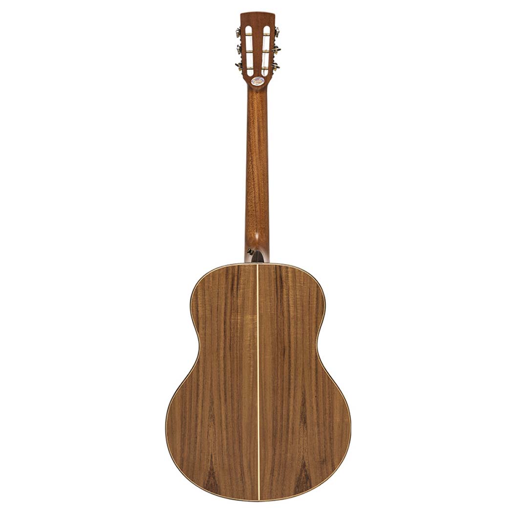 - Diapasón: Palosanto, con marcadores de posición de madera e incrustación de mariposa en el traste 12