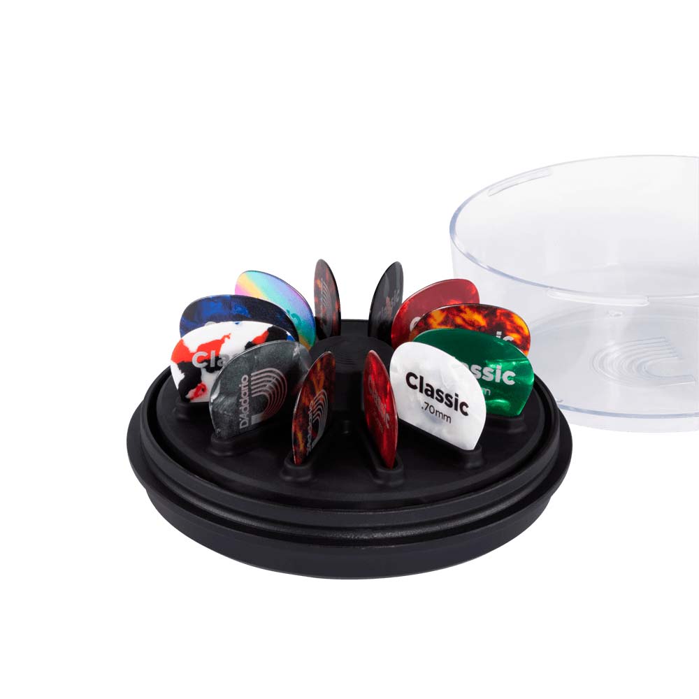 El portapúas D'Addario Pick Holder 360 es una forma divertida y sencilla de organizar tus 12 púas favoritas, para que siempre estén visibles y al alcance de la mano. La plataforma giratoria cuenta con un diseño suave con rodamientos de bolas, lo que permite un acceso rápido a tus púas favoritas. Mientras, la tapa transparente funciona también como soporte y espacio extra de almacenamiento de púas. Para sacar una púa con una sola mano, coloca el dedo índice en el centro y retira la púa con el pulgar y el dedo medio. ¡También es ideal para exhibir púas coleccionables! Nota: Las púas se venden por separado. Recomendado para púas de hasta 2 mm de grosor. Las púas de más de 2 mm no encajan correctamente.