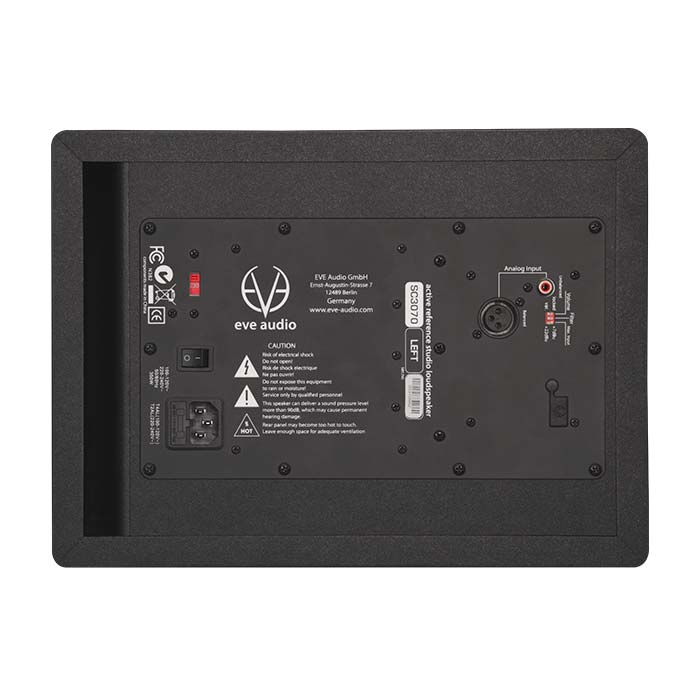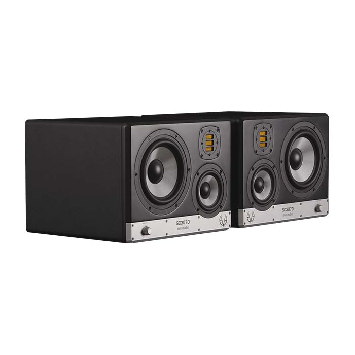 Monitor activo de campo cercano de 3 vías (lado izquierdo). Este sistema de monitoreo profesional integra tecnología DSP y una configuración tri-amplificada para garantizar una reproducción sonora de alta fidelidad en entornos de estudio.