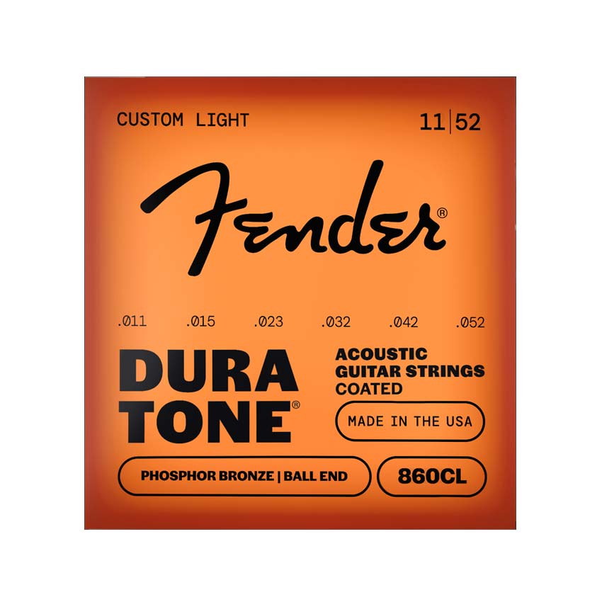 Juego de cuerdas para guitarra acústica Fender Dura-Tone 860CL Coated Phosphor Bronze 011-052. Combinando el tono rico y cálido de nuestro bronce fosforado con la resistencia y longevidad adicionales del recubrimiento Dura-Tone, estas cuerdas acústicas ofrecen a los intérpretes un sonido articulado con una fiabilidad excepcional. Encorda un juego de estas cuerdas con terminal de bola para dar brillo a tu tono y mantener a raya el desgaste, el óxido y la acumulación de residuos.