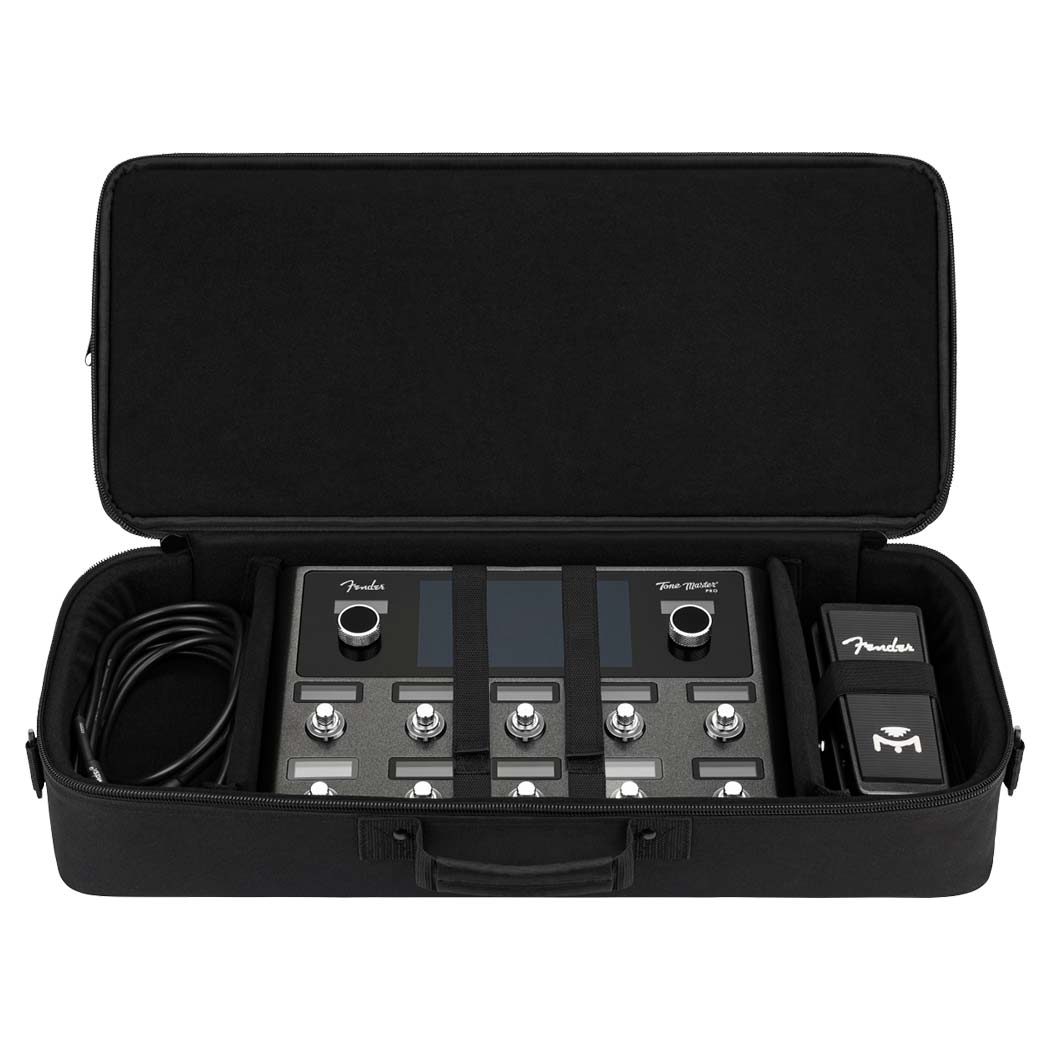 Funda para pedalera Fender Tone Master Pro Gig Bag. La funda de transporte Tone Master Pro de Fender es una forma elegante y económica de proteger tu Tone Master Pro mientras viajas. Su resistente capa exterior está fabricada con poliéster de 600 deniers que protege contra impactos y evita desgarros. El interior cuenta con espuma rígida acolchada de 10 mm con dos divisores para guardar pedales de expresión u otros equipos. Los dos bolsillos de almacenamiento en la tapa facilitan el transporte de objetos pequeños como cables y accesorios. La funda también incluye una correa para el hombro para facilitar su transporte.