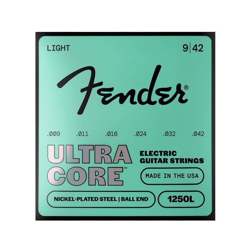 Juego de cuerdas para guitarra eléctrica Fender Ultracore 1250L Nickel-Plated Steel 009-042. Las cuerdas UltraCore™ de acero niquelado están diseñadas para guitarristas exigentes, ofreciendo una sensación refinada, claridad definida y afinación estable. El núcleo de acero de alto carbono UltraCore™ reforzado asegura un control de afinación firme y una resistencia inigualable bajo presión. Recubiertas de acero niquelado premium, ofrecen mayor durabilidad, mejor tono y definición precisa en cada nota.