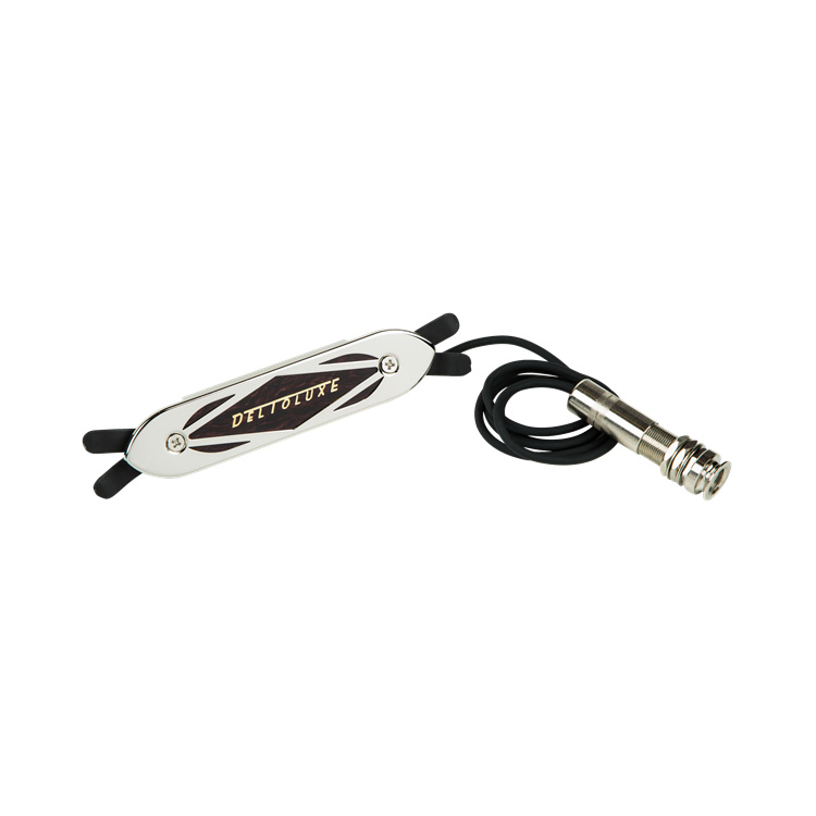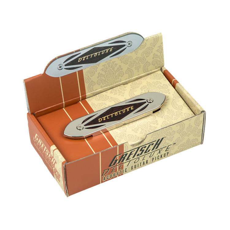 Pastilla de boca para guitarra acústica Gretsch Deltoluxe Acoustic Pickup. La pastilla magnética de boca Gretsch Deltoluxe crea un tono acústico electrificado versátil y reproduce el sonido real de tu instrumento, sin el “quack” característico de una pastilla piezoeléctrica. Esta pastilla destaca cuando se conecta a un pequeño amplificador de válvulas tipo combo, ofreciendo tonos vintage con inspiración blues hasta estilos de slide hawaiano y todo lo que haya entre medias. El diseño en carey y cromo está inspirado en el aspecto atemporal de algunos de los primeros diseños de pastillas de los años 40, a la vez que incorpora funcionalidad moderna.