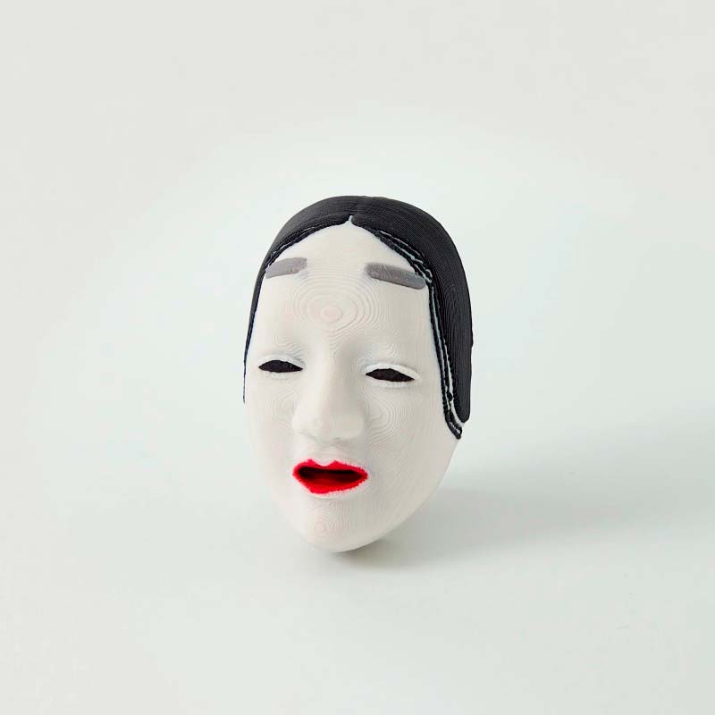 Inspirada en la tradición Noh, la máscara Koomote esconde una travesura silenciosa detrás de cada pisada.