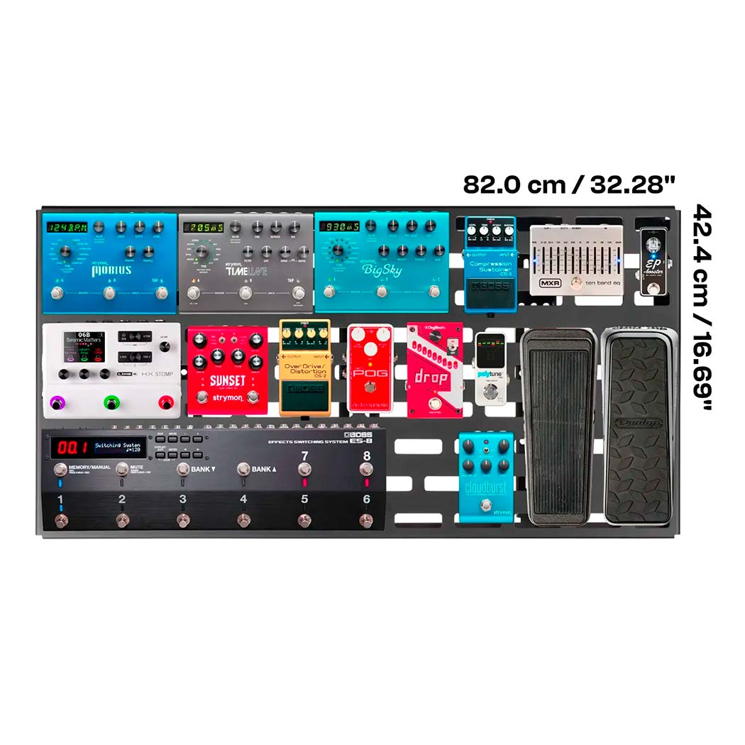 - Capacidad para aproximadamente 15 a 25 pedales de efectos, dependiendo del tamaño