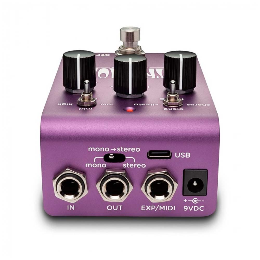 - Tres modos de funcionamiento: Chorus (mezcla 50/50), Vibrato (100% señal procesada) y un nuevo modo mixto (70/30)